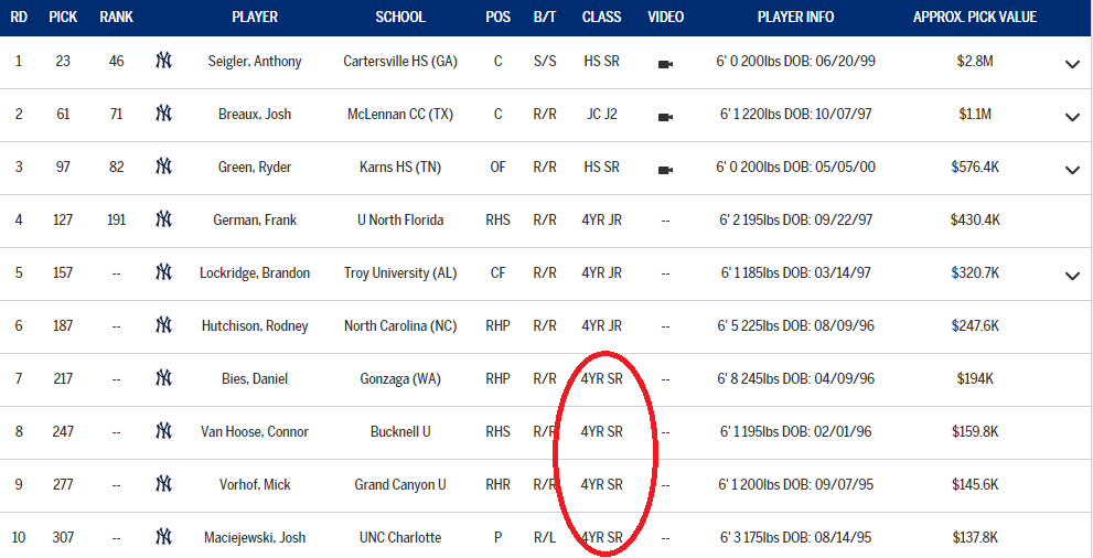 After taking two catchers on day one, the Yankees loaded up on pitchers on day two, taking six total compared to just two position players. For more details on these players, including many quotes from coaches, I definitely recommend the Mandy Bell piece. Ryder Green is easily the best prospect of this group, and he combines huge power with good athleticism. If he can make consistent contact, he can be a special player because he has all the other tools. On the pitching side, Rodney Hutchison is very intriguing because of his size and ability to change his motion from pitch to pitch. As expected, the Yankees loaded up on college seniors in rounds 7-10 to save bonus pool money.