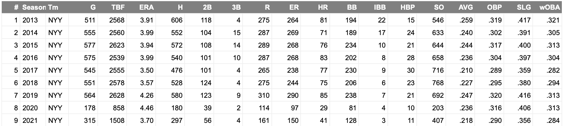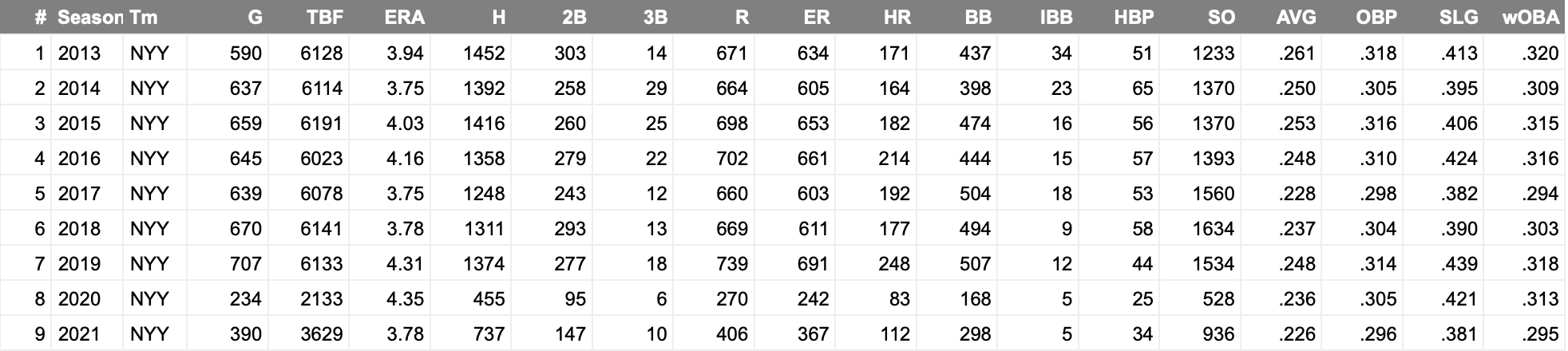 For this exercise, I am not paying attention to expectations. For example, the 2013 Yankees obviously had lower expectations than the 2021 Yankees. I am simply comparing the stats. Additionally, everything below is looking at the time period from 2013 to 2021.