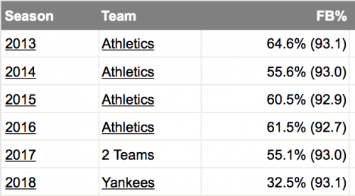 Yankees’ starters this season are actually throwing fastballs at a measly 34.3 percent clip. This is not overly surprising, as the rotation features pitchers such CC Sabathia, who has reinvented himself as more of a finesse and location-reliant pitcher, and Masahiro Tanaka, who’s go-to pitches are his splitter and slider. Luis Severino, on the other hand, has the hardest fastball on average in the majors, sitting at 97.6 miles per hour, but still has only thrown the pitch 48.4 percent of the time. Additionally, it has been shown that Sonny Gray threw more fastballs when he was with the Athletics, where he had all of his success. Getting him back towards that strategy could help him move towards reaching the expectations that he brought with him when he was acquired at the trade deadline last season.
