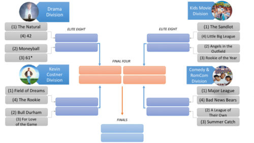 I thought it was fitting to do a Baseball Movie March Madness bracket in honor of the tournament starting. I picked 16 of my favorite baseball movies, broke them into 4 different divisions, and attempted to rank them from 1 to 16. I’m sure plenty of people will disagree with my rankings, but hey, that’s the nature of college sports.