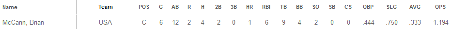 In fact, this lineup format seems to be valid, as Torre and Leyland have already collaborated: “I’ve talked to Joe a lot because he was one of the guys that reached out to me about managing the team”. In the mock draft, Yankees catcher Brian McCann was selected as one of the three catchers. According to Jon Morosi of MLB.com, “McCann provides power, a left-handed bat and WBC experience from 2009”. Below is McCann’s line from the 2009 Tournament, where he led the team in doubles: