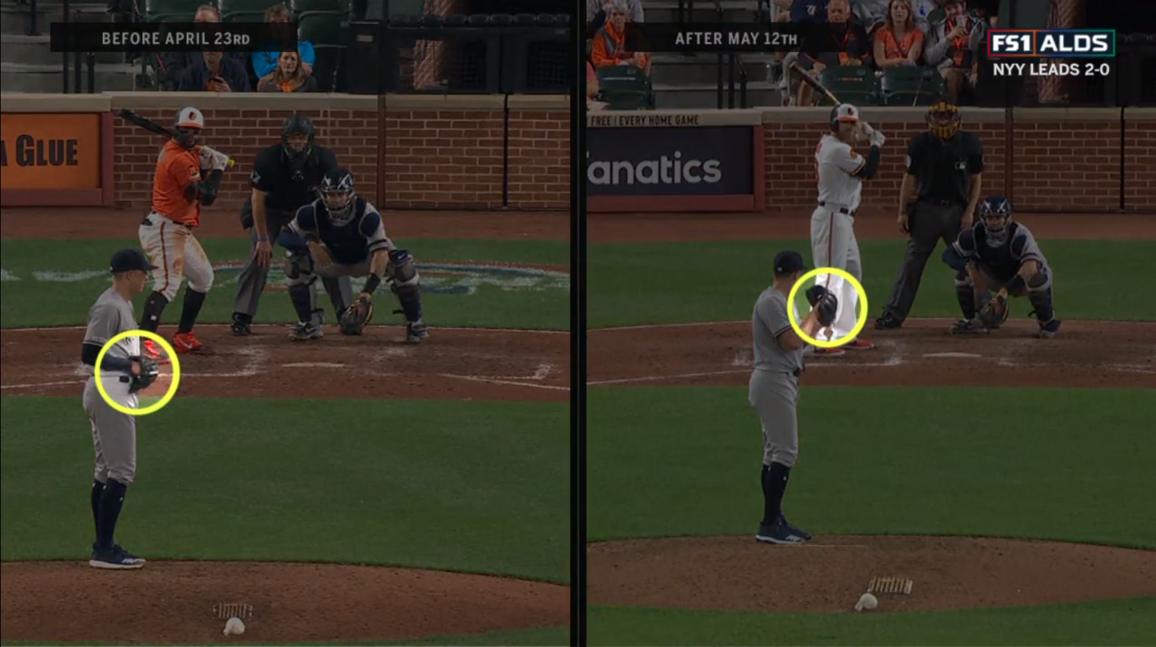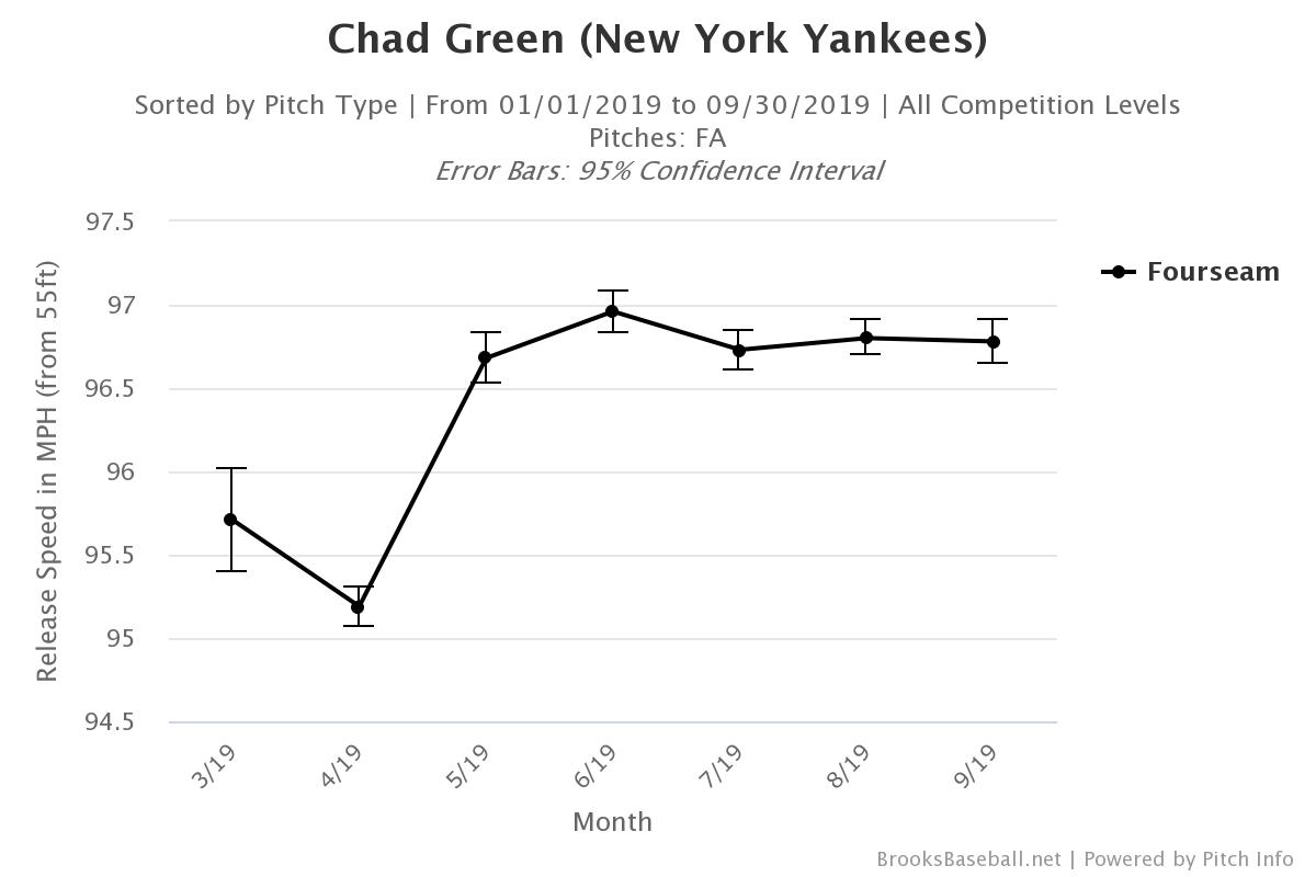 After a rough start to the 2019 season that saw him give up 14 runs in his first 10 games, the Yankees sent Green down to AAA to work on his mechanics. While in Scranton, Green and his coaches changed the location of his hands before his delivery. The FS1 broadcast made note of this during game 3 of the ALDS: