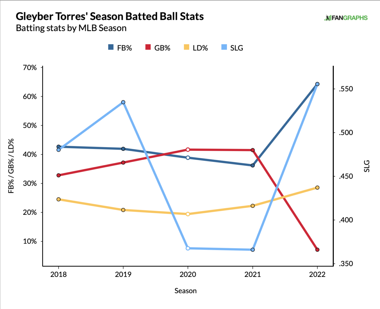 Gleyber hit .300 in 2021 with a 124 wRC+ when he played second base. Now that he’s back there nearly full time, hopefully his entire game becomes more comfortable for him. One aspect of his game that fans are clamoring for is his power. He hit 24 homers as a rookie in 2018 and followed that up with 38 in 2019 before hitting a combined 12 home runs in 2020 and 2021. Over the last two years, he was hitting fewer fly balls and more ground balls. With that, his slugging took a nosedive.