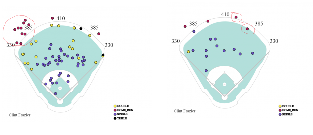 Frazier is currently hitting .324/.342/.632 good for a 151 wRC+. He has cut down his strikeout rate to a very manageable 21.9 percent, which is around league average. Whenever you can get this kind of power out of a player, a league average strikeout rate is more than acceptable. Thanks to Statcast, we can determine the “quality” of contact a player is making, based on launch angle and exit velocity off of the bat. I will spare you the nerdy details, but see below for Clint’s improvement throughout the years: