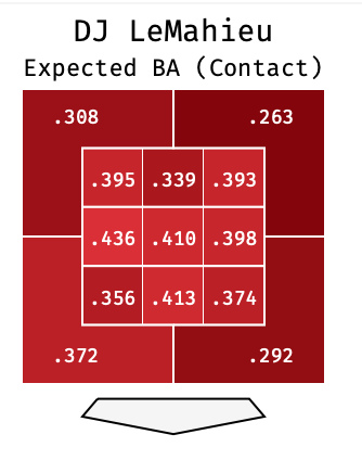 Additionally, LeMahieu was one of the best at making contact on pitches out of the zone — the league average was 59.6 percent while DJ was at 72.7 percent. Of course, making contact on balls out of the zone doesn’t necessarily result in good outcomes. However, LeMahieu had a very good expected batting in nearly all zones, including those that were not strikes.