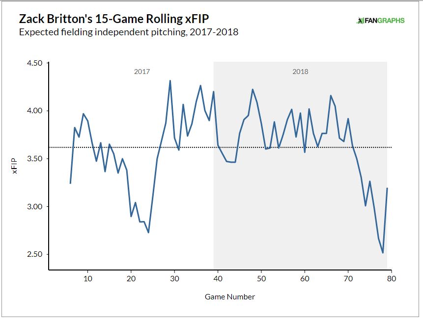 Zack Britton also suffered an Achilles injury during 2017. When he came back in 2018, he was noticeably rusty. This graph shows his rolling xFIP: