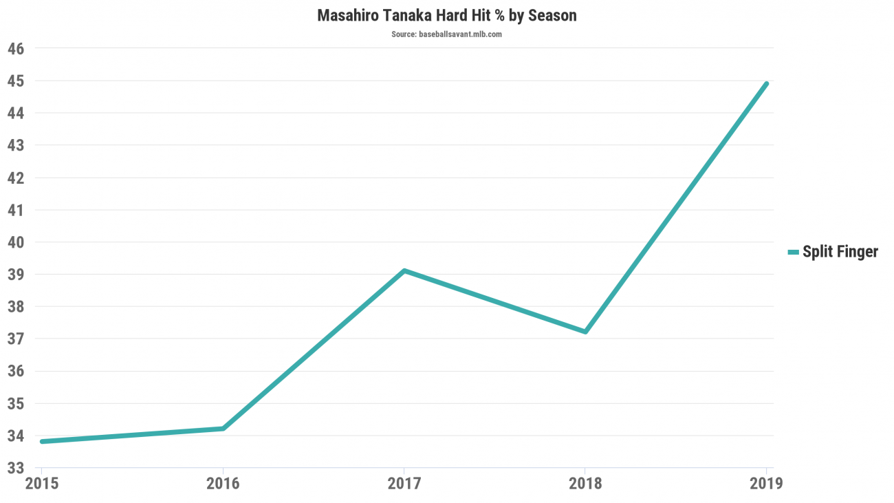 Another number that jumps out when looking at numbers against Tanaka’s splitter is opposing batters’ slugging percentage: it is currently at a whopping .678. The highest that number has been prior to this season was in 2017 (.395). We could go on and on, but a couple of other stats to point out: hard hit percentage and put-away percentage. We mentioned how the splitter is Tanaka’s most important pitch – it’s his out pitch. But his put-away percentage is at 20.8-percent in comparison to last year’s mark of 26.4. And the graph below shows that his splitter is being hit harder than ever.