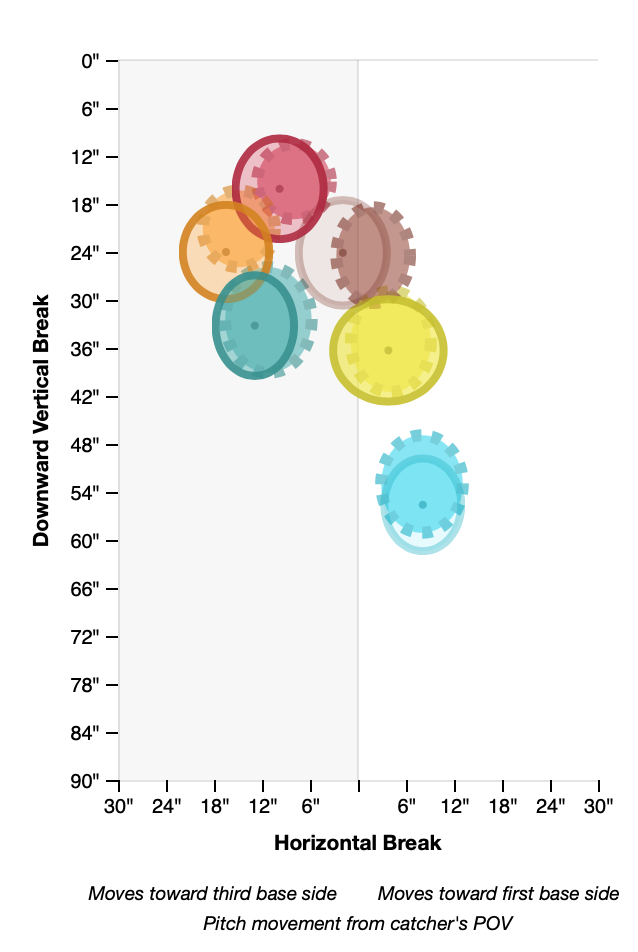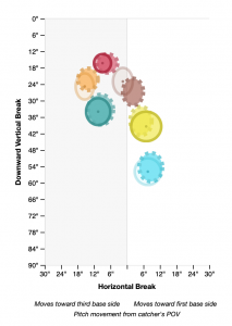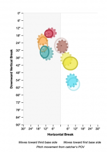 The below graphic depicts the movement of Tanaka’s pitches from each of the past three seasons. The gear-like shapes represent league averages. The teal-colored shapes represent the splitter. The dots are the average movement while the ovals show the 75-percent range.