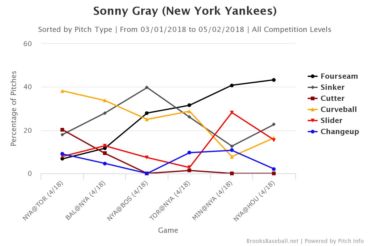 In his start on Monday, Gray threw 42 four-seamers and 22 sinkers for a total of 64 out of his 97 pitches. That works out to a staggering 66%, which is his highest fastball usage of any start this season. You can see this usage change in the chart from Brooks Baseball.