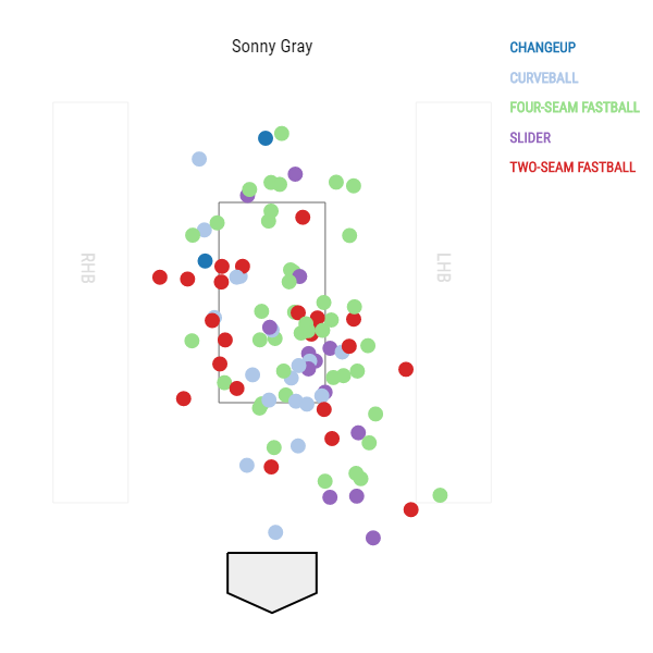 You can see that not many pitches were in the middle of the zone, which is what you want. You can also see how Gray mixed his four-seam fastball between the lower part of the zone to get called strikes and then up in the zone to get swings and misses to put hitters away. Additionally, you can see how most of the curveballs and sinkers are down or below the zone which is exactly where they should be.