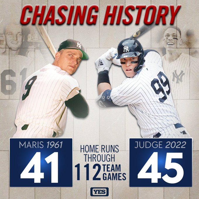 BRONX, N.Y. — In the chase for 62 home runs, Aaron Judge (45) is four ahead of Roger Maris's (41) pace for the American League, and New York Yankees franchise (and according to some MLB) records. Judge is also way ahead of the pace for most home runs in the junior circuit for a right-handed batter, 58, held by both Hank Greenberg and Jimmie Foxx.