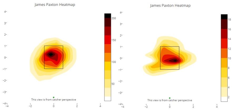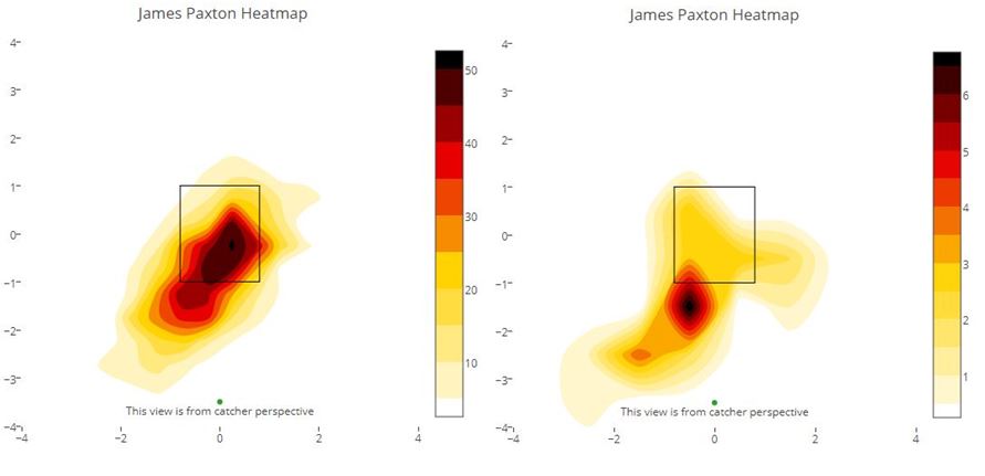 The one on the left is for 2017/2018, and the one on the right is from this season. You can see how in the past, Paxton tended to throw his fastball up and close to the middle of the plate. So far this season, he is throwing his fastball lower and closer to the outside corner against righties. Paxton is known for having great swing and miss tendencies on his fastball, which usually leads to more pitches thrown up in the zone. It will be interesting to see if he continues using his fastball lower than in the past to try and keep the ball on the ground more.