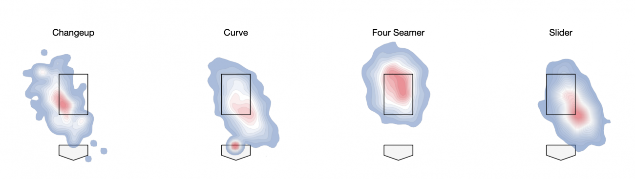 Red = Fastball; Yellow = Slider; Blue = Curveball; Green = Changeup