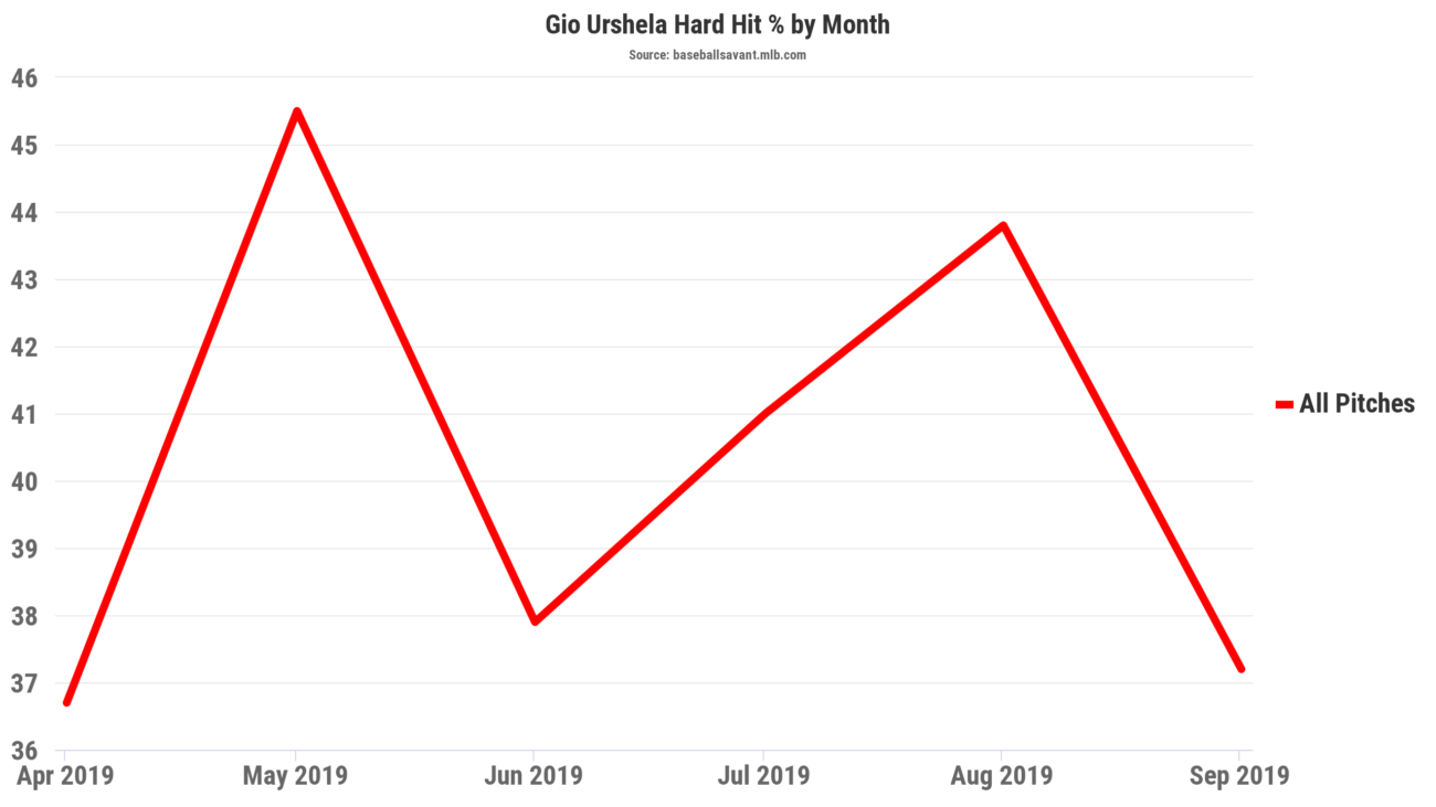 You can see by the below graph that Urshela’s had very good months in May and August in terms of wRC+, but even in his down times he was still hitting that ball hard.