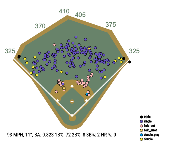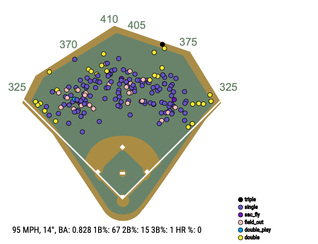 Giancarlo Stanton The above field views show batted balls that had about the same launch angle and exit velocity as Judge and Stanton’s averages. While the two are almost equivalent, it appears as if Judge’s average launch angle and exit velocity have resulted in balls hit in the infield. Judge has the slight advantage here in batting average and doubles percentage, whereas Stanton has the advantage in singles percentage and triples percentage. None of the balls hit with these average launch angles and exit velocities in 2018 resulted in a home run.
