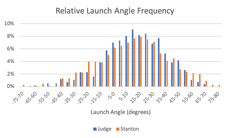 Based on the graphs above, Judge had an exit velocity between 110 and 115 MPH more often than Stanton, but Stanton had a slight edge above that. In terms of launch angle, physics tells us that 45 degrees in the optimal angle. However, as aforementioned, the “sweet spot” is generally deemed to be 25-35 degrees. Between 25 and 30, Stanton had the slim edge, while Judge has a larger lead in balls hit between 30 and 35 degrees. Overall, it seems harder to draw conclusions from this chart. But speaking of the “sweet spot”: Judge has averaged about 37.1 percent of his batted balls being off the sweet spot of the bat; Stanton is at 30.8 percent.