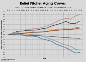 The below graph shows relievers aging curves as developed by Bill Petti and Jeff Zimmerman of FanGraphs. The data was gathered from the 2002-2011 seasons, but can still be applied to this situation. It can be seen that relievers tend to lose about three miles per hour of the velocity from the beginning of their careers to the time they are in their late-30s.