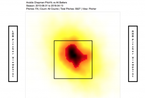 It can be seen that over the course of his career, most of his fastballs have been in the middle of the zone. Again, Major League hitters will do damage with these pitches, but the sheer velocity that Chapman currently possesses allows him to circumvent this dilemma.