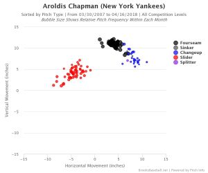 He also has a decent amount of rise to his fastball. Of course, when you're throwing 100-plus miles per hour up in the zone, it is hard to layoff as a hitter. In his career, Chapman has gotten 31.3 percent swings on pitches out of the zone. The average across the MLB in 2017 was 29.9 percent. So he's able to generate a few more out-of-the-zone swings. However, if his velocity decreases even slightly, it could open the door to batters being able to see the ball better and perhaps lay off those high pitches out of the zone.
