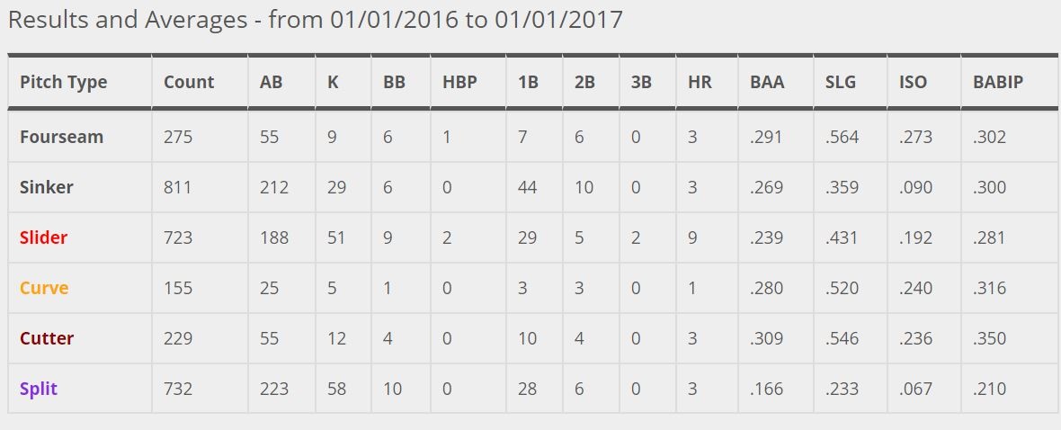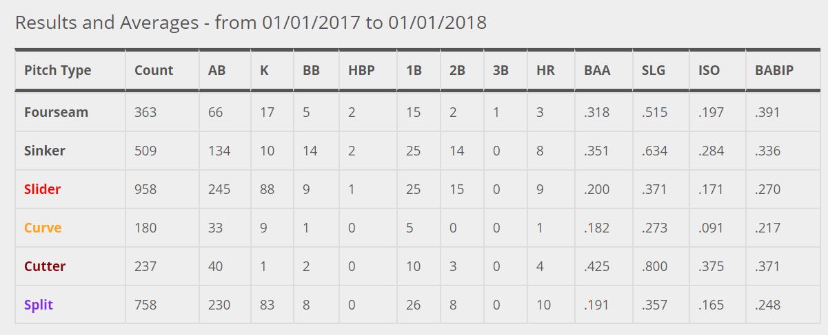 From left to right, the chart tells us about Tanaka’s 5 primary pitches: four seam fastball, slider, splitter, sinker, and curveball. As we’ve already discussed, his splitter and slider have been fantastic in each season. His curveball is about average; he rarely throws it, and uses the pitch just to steal a strike on occasion. This brings me to my point: Tanaka’s most important pitch in 2018 will be his sinker. He throws fewer four seam fastballs then he used to, and needs to utilize his sinker so hitters can't just sit on his splitter or slider. The problem is his sinker was inconsistent at best last year, and yielded a ton of extra base hits. Tanaka also gave up a whopping 21.2% home runs per fly ball last year, which was the worst in the league by a wide margin. This was the biggest change between his 2016 season (3.07ERA, 3.51FIP, 4.6WAR) and last year (4.74ERA, 4.34FIP, 2.7WAR). Let’s compare his pitch outcome data from 2016 and 2017 via brooksbaseball.net: