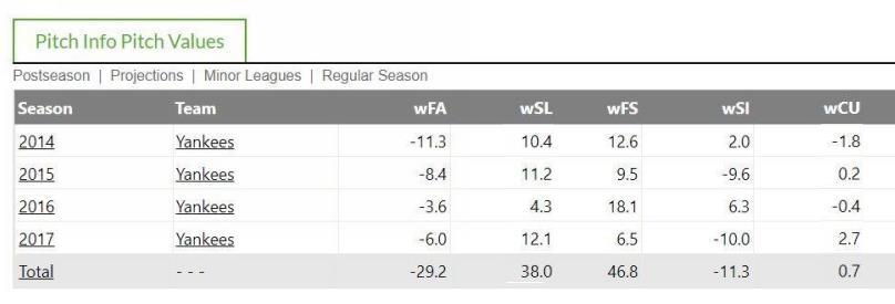 If I asked you which one of Masahiro Tanaka’s pitches were most important, you would probably say his splitter, since it’s one of the best in baseball. Perhaps some of you would mention his slider, which would also be fair. Since 2014, Tanaka’s first season with the Yankees, both of these have been above average pitches for him in each season. Fangraphs has a nice, tidy chart which tells us how many “runs above average” each pitch in a pitcher’s repertoire is. Here is the data on Tanaka from 2014-2017: