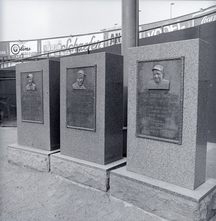 The monuments of Lou Gehrig (l.), Miller Huggins (c.), and Babe Ruth (r.) in deep center field in Yankee Stadium. On this day 64 years ago, it was Opening Day of the 1949 season. Slightly over eight months after the passing of The Sultan of Swat, Babe Ruth, the Yankees unveiled a monument in his honor in center field next to other Yankee legends Lou Gehrig and Miller Huggins. The Yankees would go on win the game 3-2, with Eddie Lopat getting the complete game win, and Tommy Henrich hitting a game-winning home run in the bottom of the 9th inning. As written in the St. Petersburg Times on April 20, 1949: