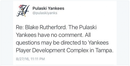 Late on Saturday, the New York Yankees' advanced rookie level team the Pulaski Yankees issued the following statement in regards to outfielder Blake Rutherford. The tweet was taken down roughly a half hour after it was posted.