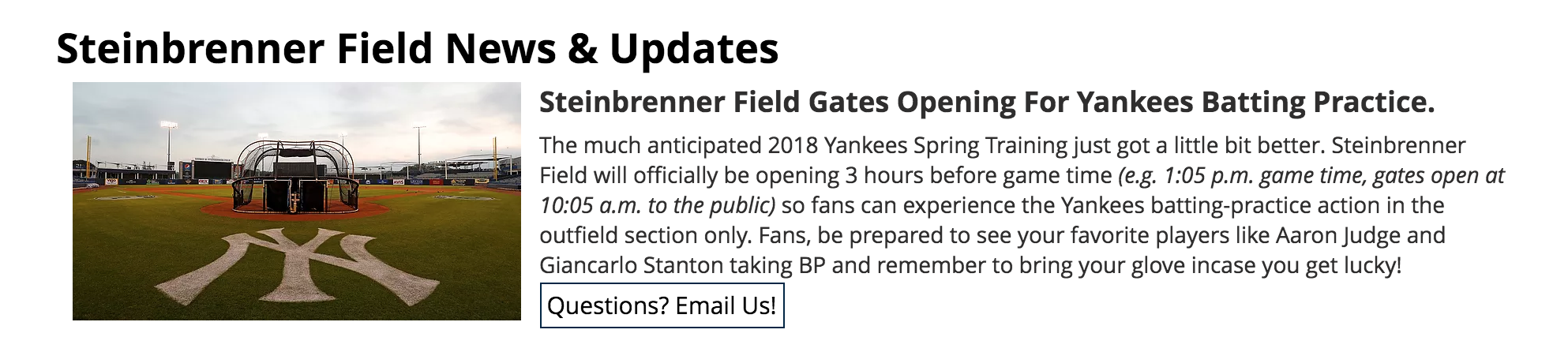 Prior to all home games, fans will get the opportunity to watch the Yankees' batting practice in its entirety. According to an official announcement on the George M. Steinbrenner Field website, gates will open three hours prior to first pitch, an hour earlier than usual.