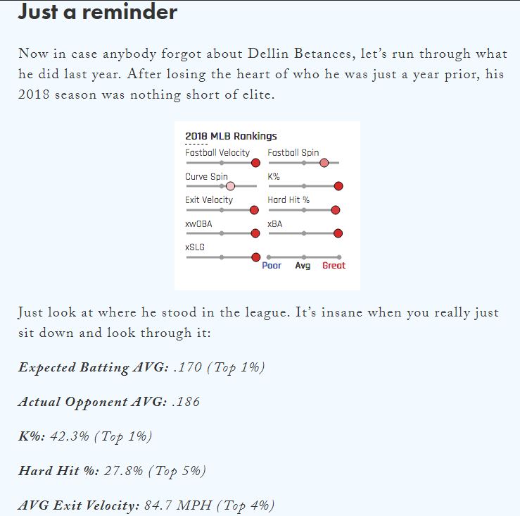 The second piece is that help is on the way. As Joe wrote last week, Dellin Betances is nearing a return! That is great because Dellin is arguably the best pitcher in the Yankees bullpen. Because he’s my favorite player, here are some stats and metrics to wow you from Joe’s article:
