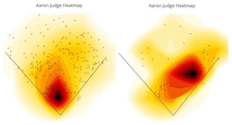 The 2018 heatmap is on the left, and 2019 is on the right. Look at the difference! Last year Judge was driving the ball all over the field, and you can see where he drove the ball to the pull side. This year, everything seems to be going to right field, and I count one home run to the left side of the field.