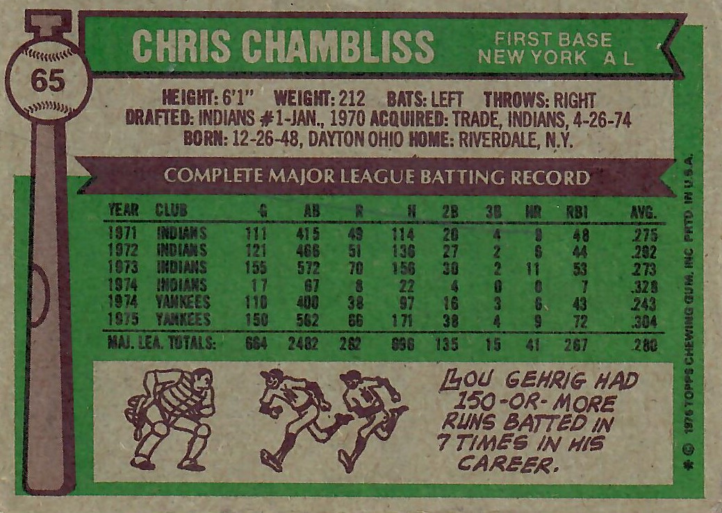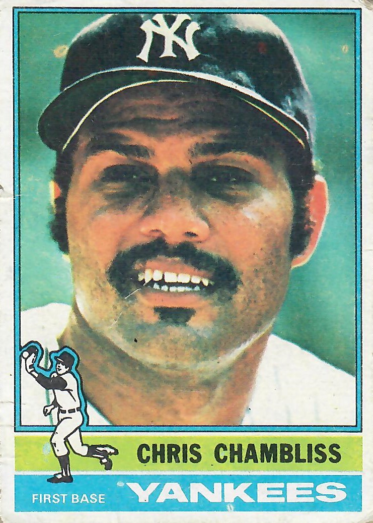 In '76 Chambliss enjoyed his most productive season of the seven he spent in pinstripes, earning the only all-star distinction of his career. His .293/.323/.441 slash line coupled with career bests in hits (188), doubles (32), triples (8), and RBIs (96) helped lead the Yanks to a 97-62 mark and the division crown, setting up the first match-up of an ALCS trilogy with Kansas City. In the deciding fifth game at the Stadium, the Bombers led 6-3 in the 8th when George Brett knotted the game with a 3-run home run off Grant Jackson.