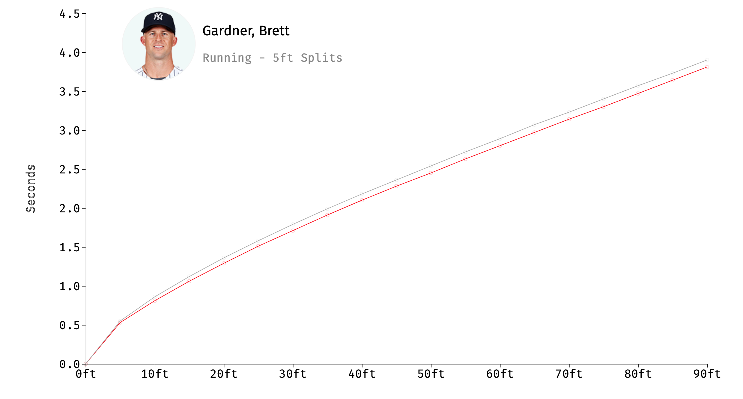 Even in his age-35 season, he 29.2 feet per second sprint speed ranked in the top six percent of the league (42ndoverall and best for his among players his age). In fact, Gardner could very likely steal many more bases if he were to improve his aggressiveness and reads. Whit Merrifield of the Royals lead the majors last season with 45 steals and his sprint splits are shown by the gray line below while Gardner’s are represented by the red line.