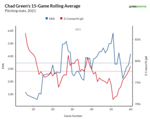 Green's Z-Contact% and the ERA are both rapidly climbing. Z-Contact% is contact made on pitches in the zone, which could mean that Green's not getting enough elevation on his fastball. The climbing ERA is the self-explanatory result of said elevation (or lack thereof). Green's giving up more contact and because of it, he's giving up more runs. Green's reliant on his ability to generate whiffs, and the Yankees are going to need to rest Green so he can do so effectively.