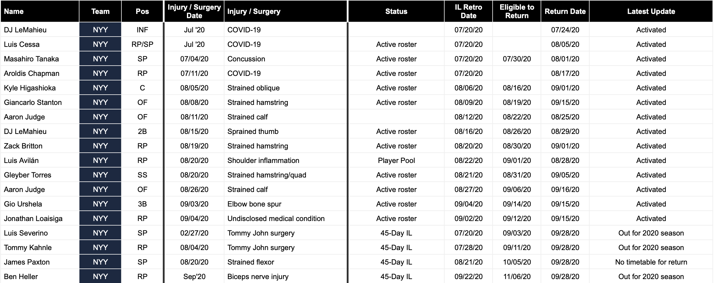 Oof, August was not pretty. We lost the entire top half of our lineup, a good starting pitcher, two of our best relievers, and our backup catcher. So it looks like the longest we went without an injury from Aroldis Chapman’s bout with COVID and Kyle Higashioka’s strained oblique — an impressive span of 25 days! And if we don't count COVID-related absences, it was 32 days! And if we only count injuries during the season, it was 18 days! In conclusion, it seems the longest we can go without an injury is around 20-25 days. That’s almost one month free of serious injuries!