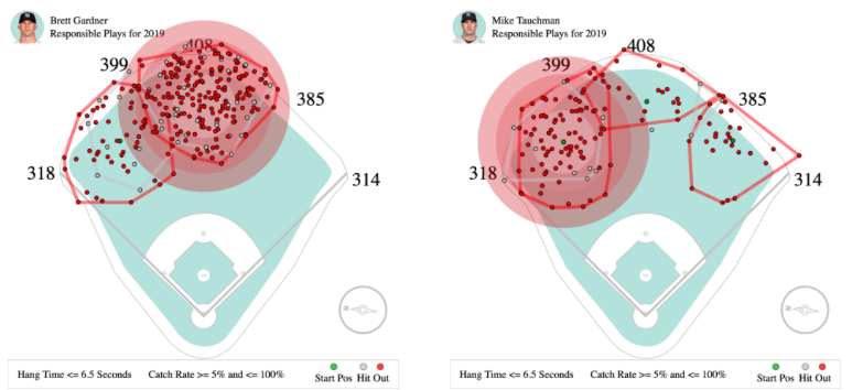 The first four columns are components of an outfielder’s jump, while the last two represent the jump itself. In 2019, Tauchman made 65.9 percent of balls in play that were rated as 2+ star catches (7 OAA on these balls); Gardner was at 41.9 percent (0 OAA). All these stats point towards Mike Tauchman perhaps being the more mobile center fielder. And it’s not like left field at Yankee Stadium is a walk in the park — Gardner is very familiar there and can still cover the gap. But I would guess that if these two are the starters in those positions, the first crack will be Gardner in center and Tauchman in left.