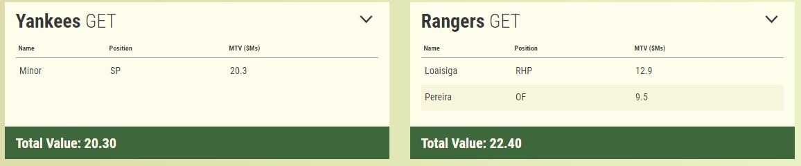 The common theme in these packages is that if the Yankees want to keep Frazier or Garcia, it will take two top 10 prospects to get a deal done for Minor. You see the drastic drop-off in trade value between a top prospect like Garcia (26.3) and the 9th prospect in Contreras (5.4). Thus, the Yankees cannot just send a quantity over quality package. It will take one of the Yankees top prospects – likely either Estevan Florial or Clint Frazier.
