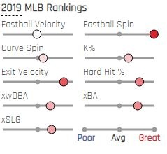 Everything there is at or above average. Average fastball velocity with an elite spin rate makes for a great fastball. You can see the above average K% which is what you want for pitchers in Yankee Stadium. But the real encouraging information is the batted ball data. Simply put, batters do not hit the ball hard off Minor this season. He has great exit velocity and hard hit % numbers as well as strong xwOBA, xBA, and xSLG. What those “x” stats mean is that the strong performance so far is likely not a fluke because we would not expect batters to be doing better than they are against Minor. And, more importantly, moving forward I do not see reason to expect strong regression.