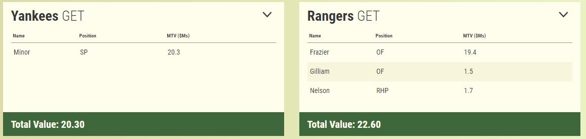In this proposal, Clint Frazier is the headliner. If I’m the Rangers, my ask starts with one of Frazier or Deivi Garcia. Garcia is off-limits in this trade for me because his trade value is actually higher than Minor’s at 26.3. Plus, I could see Garcia helping out at the major league level by the end of this season. You can see how Frazier and Minor have eerily similar trade values, but the Yankees would need to kick in a few smaller pieces to get a deal done. I chose Isiah Gilliam and Nick Nelson as those pieces because they are likely trade candidates I wrote about a few weeks ago. Nelson is a AA pitcher with some control issues and Gilliam is a AA outfield prospect. Most trades for starting pitchers involve 3-4 pieces to account for the inherent risk of prospects, and this seems like a fair trade.