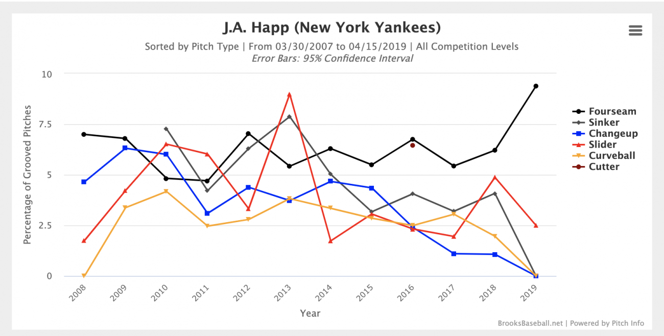Whoof. Where to begin with Happ, whose first three starts have all come against subpar competition and have all been absolutely terrible? When a player gets off to a start as bad as he has, there are usually clear indicators in the data as to why the pitcher is struggling. Interestingly, in this case, many of the usual places you'd go to give little to no indication of what's going wrong.
