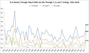 More specifically, you can see that even though the rate at which players are swinging at pitches out of the zone (O-Swing%) is at it lowest in the last five years, they are making less contact on those pitches (O-Contact%), as well as those in the zone (Z-Contact%). And overall, they are making less contact (Contact%). Also, fastball usage has been gradually going down across the league, and with all of these factors mixed together, it creates a scenario where hitters are striking out more than ever and pitchers are able to exploit this. They are more throwing pitches out of the zone, which also leads to the walk rate being high across the board. Here's shocking tidbit from Ben Lindbergh of The Ringer: April 2018 was the first month in Major League history where there were more strikeouts than hits. He also presented the below graph, which shows the percentage of games through May 8 of each season from 1961 that had no-hit bids through five, six, and seven innings.