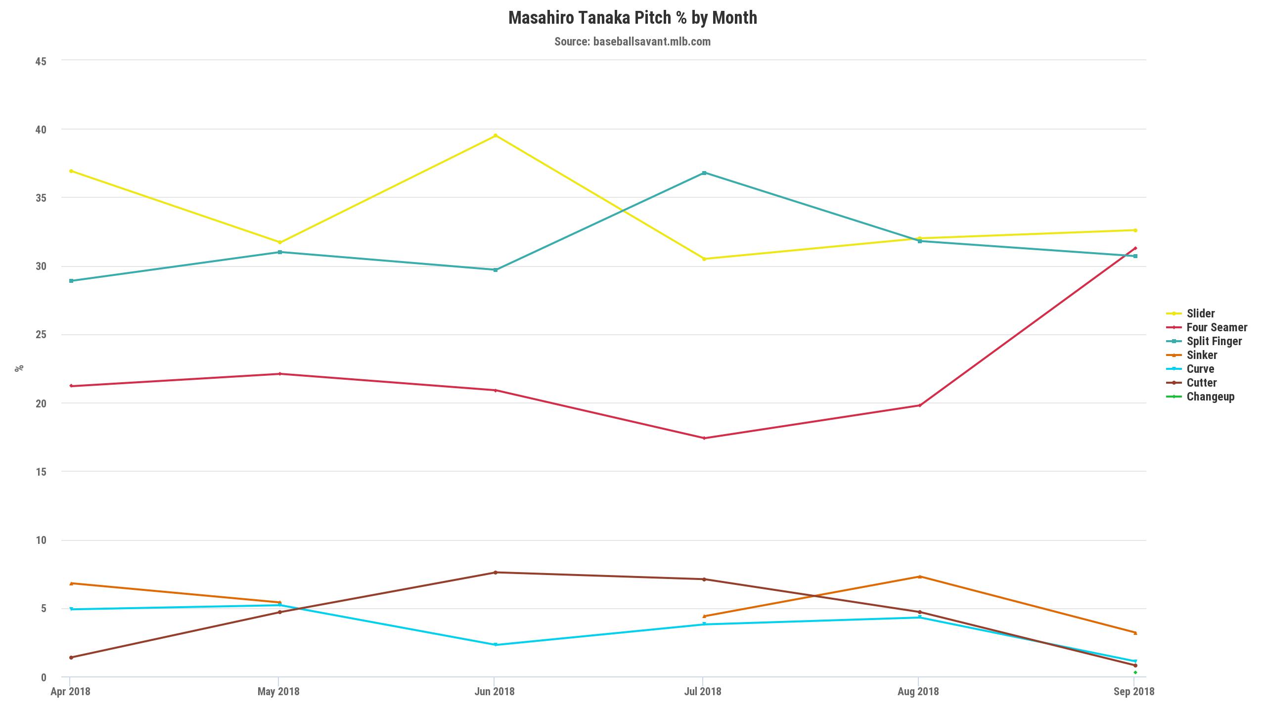 I am a big believer of riding the hot hand going into the playoffs. Overall this season, Tanaka has a 3.75 ERA (4.01 FIP) in 156 innings, but that only tells part of the story. Tanaka has been mixing in his four seam fastball more lately and it seems to be working for him. He has dazzled in the second half (last start notwithstanding) throwing 72.2 innings of 2.85 ERA ball. His ground ball rate has increased from 44.7% in the first half to 50% in the second half. His home run rate has also gone from 1.94HR/9 to 0.87HR/9. Giving up less home runs is good, guys. I think using his four seamer a little more than he has in the past is making him not only less predictable, but it’s improving his breaking pitches as well. See below for his pitch selection chart: