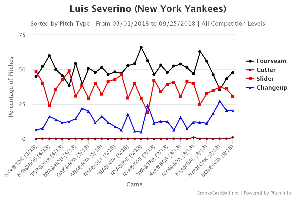 The chart shows pitch usage by start for this season. You can see how in the past month Severino has increased his changeup usage while simultaneously lowering his slider usage. That adjustment may be what has helped him be more effective in his last few starts, including his gem last week against the Red Sox.