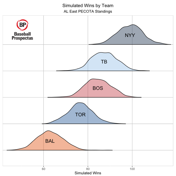 BP does a cool thing where they show you the range and likelihood for each team’s total wins, and here is what the AL East looks like: