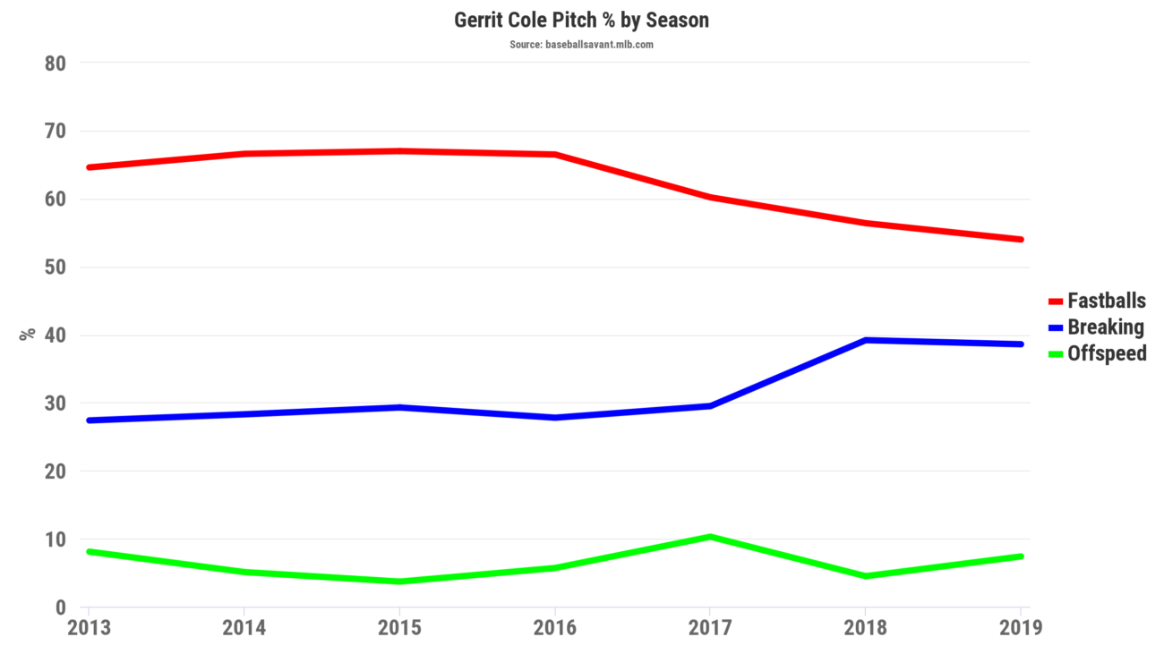 Look how Cole drastically decreased his fastball usage in 2018 and 2019 and increased his breaking ball usage. That lines up with his trade to Houston and revamping of his arsenal. He became an ace after those changes and is now the best pitcher in baseball.