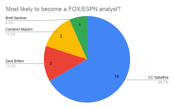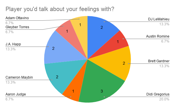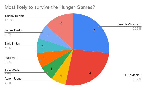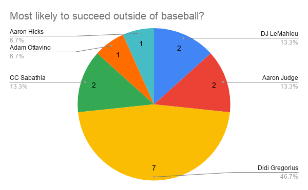 This one was a little more one-sided, with Didi Gregorius getting a majority of the votes. It makes sense - he an amazing artist, he speaks five languages, and he’s already a knight. In regards to some others receiving votes, I think that Aaron Judge’s size can allow him to do many things. One example is he can become a firefighter and get kittens out of trees. Or wash really high-up windows. Aaron Hicks is a great golfer, Adam Ottavino is into photography and all the analytics, CC Sabathia seems to be a multi-faceted guy, and DJ LeMahieu can do anything of course.