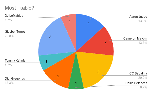 Once again we have a wide collection of players receiving votes. CC makes sense — he’s a big teddy bear that will go to war if you mess with him or his team. Gleyber Torres is only 22 and is already a superstar, making him very likable. I thought Judge would garner some more votes, but it is nice to see that people think so many different players on this team are likable.