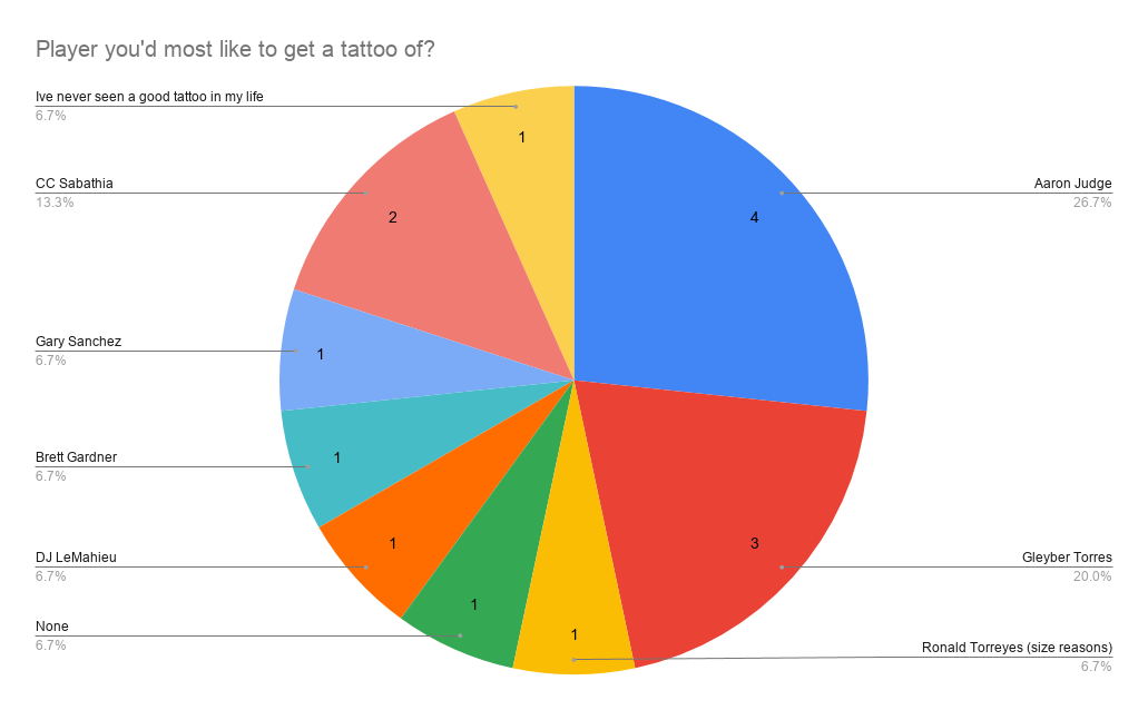 We got a bunch of different answers here, including some write-ins. Some seem to oppose getting a tattoo while one individual believes Ronald Torreyes should make a guest appearance on their body. But the face of the Yankees comes out on top.