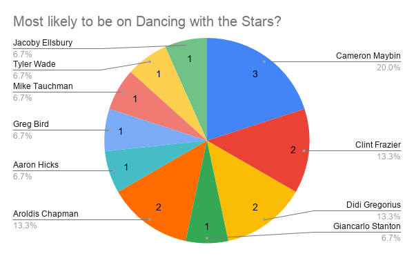 Another diverse set of answers! I would be interested in seeing Greg Bird dance, but we all know that could cause him to strain his left lobulus auriculae (fancy name for earlobe). Same with Ellsbury. I would have to agree that Cameron Maybin seems like he could bust some nice moves among the stars.