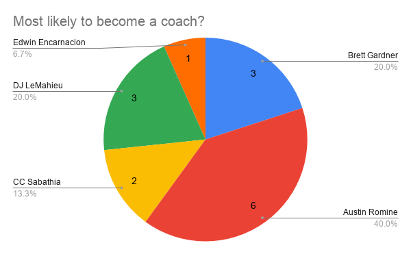 This one surprised me a bit. Perhaps it goes along with the many former catchers who have become major-league managers, but I did not expect Austin Romine to garner the most votes. I would love to see DJ as a coach; as aforementioned, he’d probably win something like 140 games in his first year as a skipper.