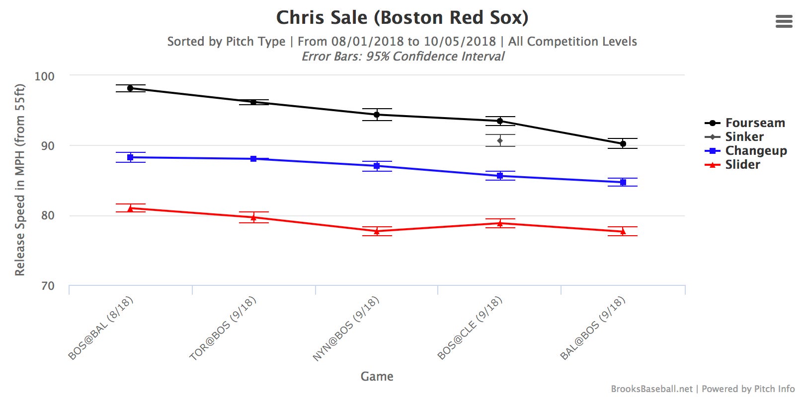 Perhaps the most significant variable in determining the outcome of this series will be Chris Sale. After battling shoulder injuries throughout the last couple months of the season, Sale returned in September with an alarming drop in his velocity. Just check out this graphic of his average fastball velocity over his final few starts.